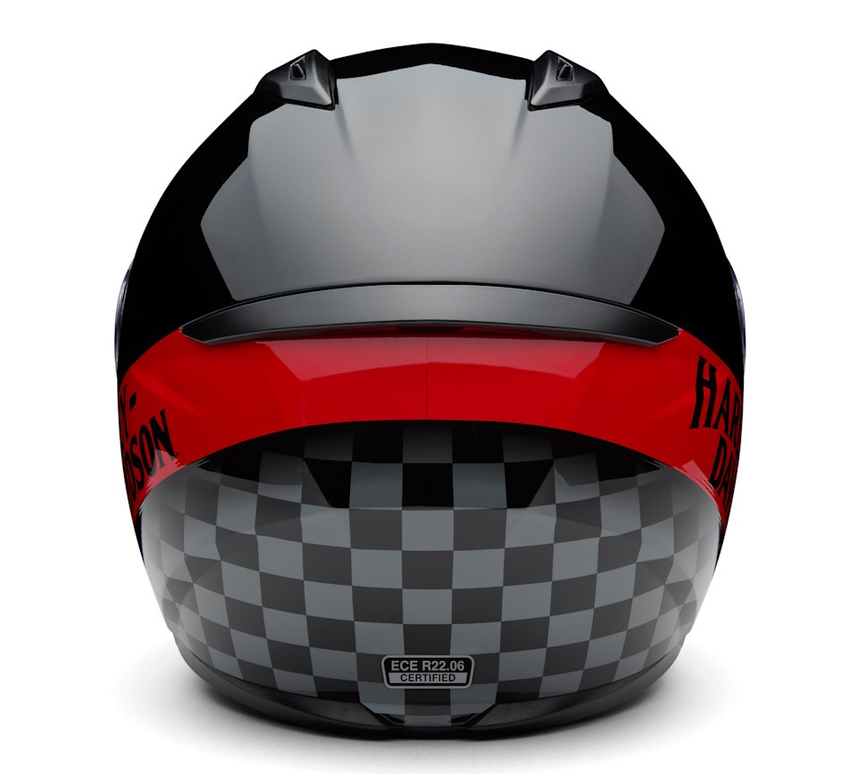 Race-inspired styling goes the distance with comfort in our latest H-D™ Velo H34 Full Face Helmet. Built from a polycarbonate composite for a superior, lightweight fit, its certified design wisely features an advanced channeling ventilation system that fully flushes out heat and humidity as you ride. This full face motorcycle helmet has a rear spoiler to reduce drag, grooves to accommodate eyewear, and an anti-scratch face shield with 99% UV protection. Its Gloss Harley Black Metallic finish and checkered flag graphics create a winning look for racing and Screamin’ Eagle performance fans alike. Learn more in the specs below, then snag yours ASAP.